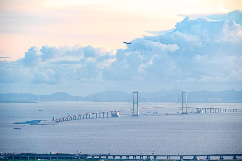 6月23日,从深圳宝安国际机场起飞的飞机飞过深中通道。新华社记者 毛思倩 摄