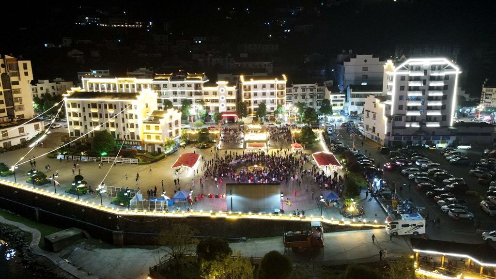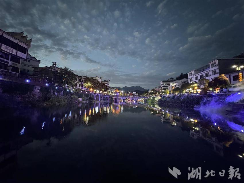 10月2日晚,大批游客聚集在罗田九资河镇鸠兹古邑文旅休闲街,欢度国庆假期,或漫步街头“逛吃”,或欣赏两岸小桥流水人家的景色。(选自 湖北日报客户端罗田频道 作者 周惠)