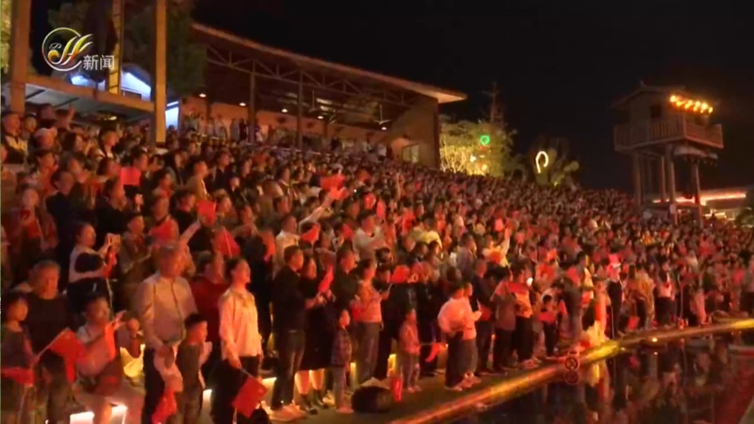 在恋江湖船歌岛嘉鱼不夜城景区,来自省内外的6万多名游客尽情享受着以西游为主题的互动演绎,美人鱼、火壶、打铁花、大闹龙宫、烟花等表演,游客们享受着一幕幕视觉盛宴。为国庆特别打造的《五星红旗》《歌唱祖国》等快闪节目,也在景区内不同地点呈现,游客们纷纷参与,共同歌唱,传递着对祖国的美好祝愿。