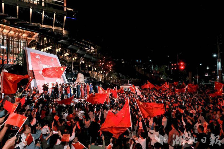 随着熟悉的旋律响起,现场氛围逐渐热闹起来,人们自发地加入合唱中,跟着节奏挥动着手中的五星红旗,近万人的声音汇聚起来,穿过夜空,化作给祖国母亲最真挚的礼物。