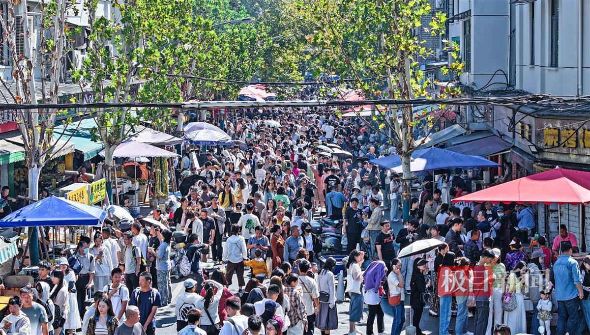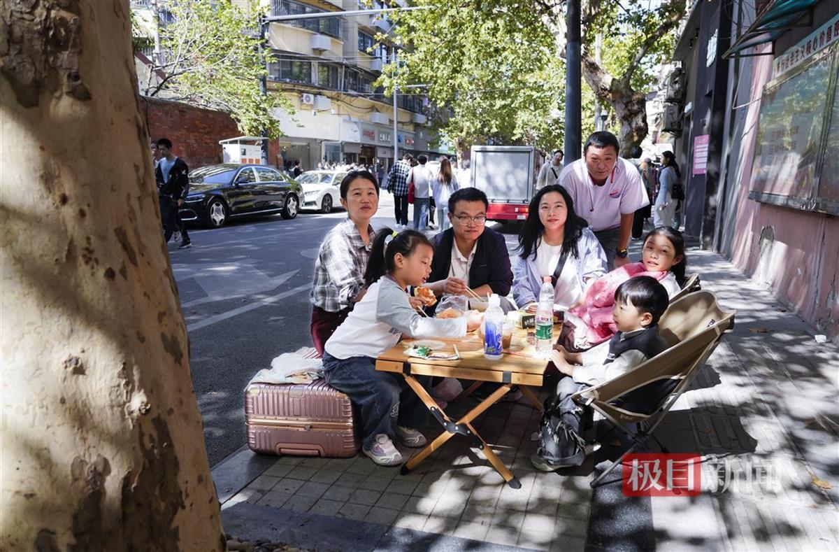 10月3日,武汉市江岸区山海关路,来自合肥、长沙的姐弟两家人在路边吃早餐,阳光透过树叶温和地洒在地上,餐桌前响起欢快的笑声。