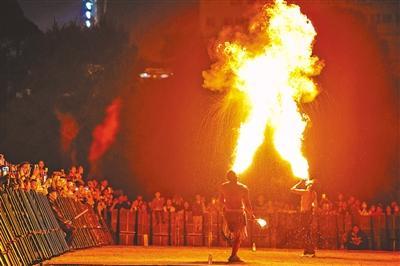 10月4日晚,在武汉园博园内,整合彝族、白族、纳西族等民族火文化的喷火、火立方、火棍、火壶等火舞表演,引来游客阵阵欢呼。图为喷火表演。(湖北日报全媒记者 倪娜 通讯员 徐志刚 摄)