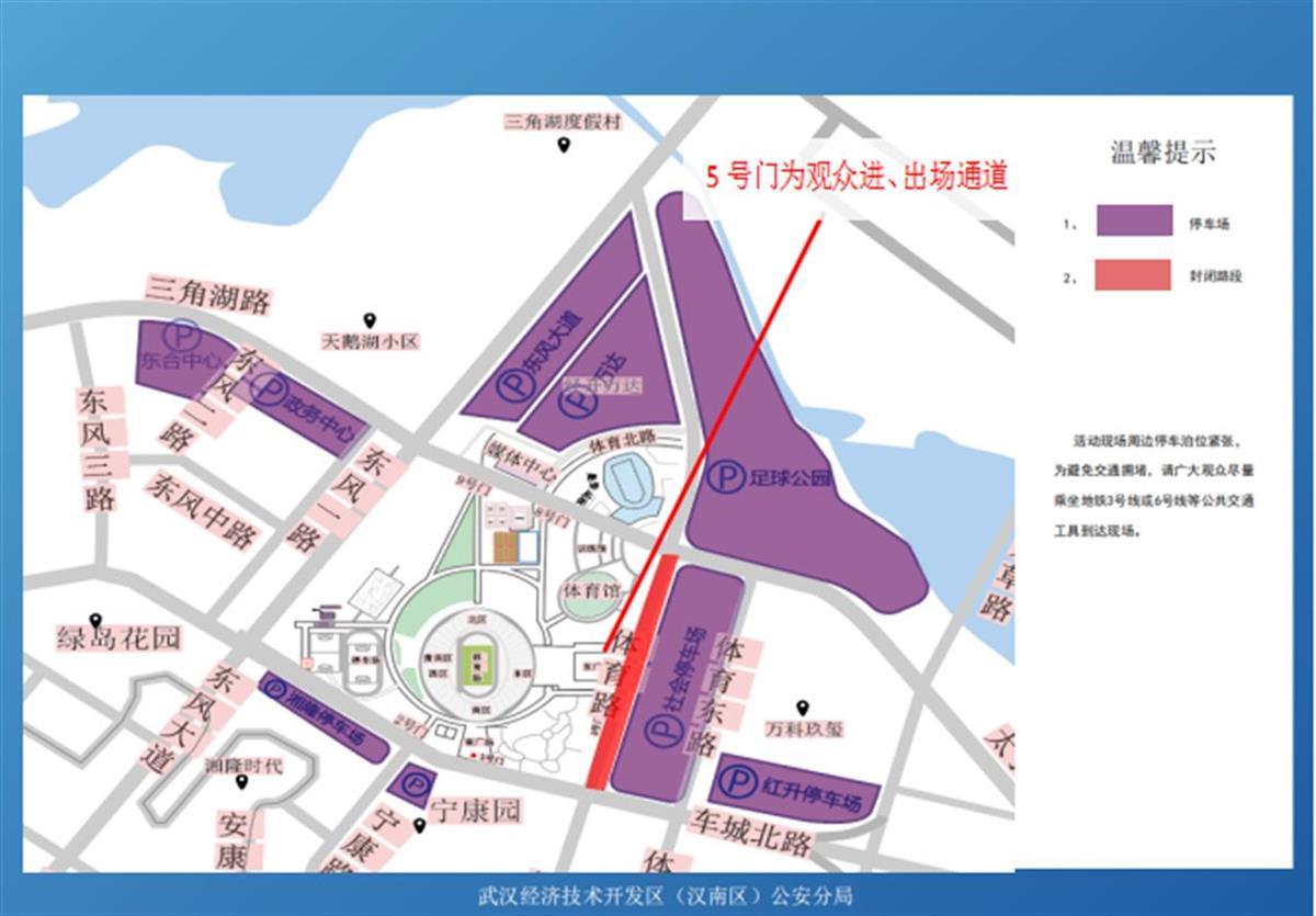 1、由于活动持续2天,每场观众较多,体育中心周边道路车流增多,前往体育中心周边的人员请尽量错峰出行,高峰时段请做好出行规划,尽量避免进入体育路(东风大道至神龙大道)、太子湖路(体育路至芳草路)、体育东路、车城北路(体育路至体育东路)、宁康路路段,需通行该区域的人员或车辆,可选择绕行神龙大道、沌阳大道、太子湖北路、江城大道等外围道路。