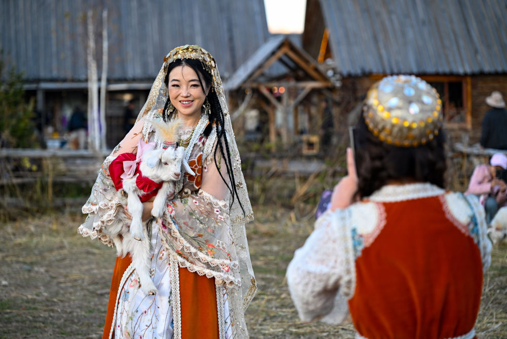 10月2日,游客在新疆阿勒泰禾木村打卡拍照。新华社记者陈朔 摄