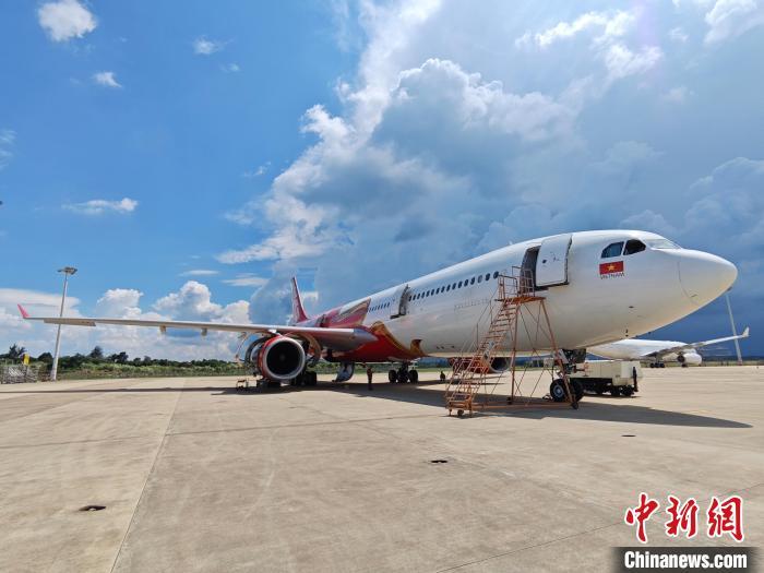 8月26日,越南越捷航空公司空客A330客机正在海南自贸港一站式飞机维修产业基地进行检修。中新社记者 王子谦 摄