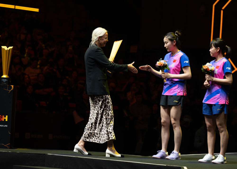 10月5日,索林(左)为获得世界乒乓球职业大联盟(WTT)中国大满贯赛女双冠军的陈幸同(右)/钱天一颁发奖杯。新华社记者 肖艺九 摄