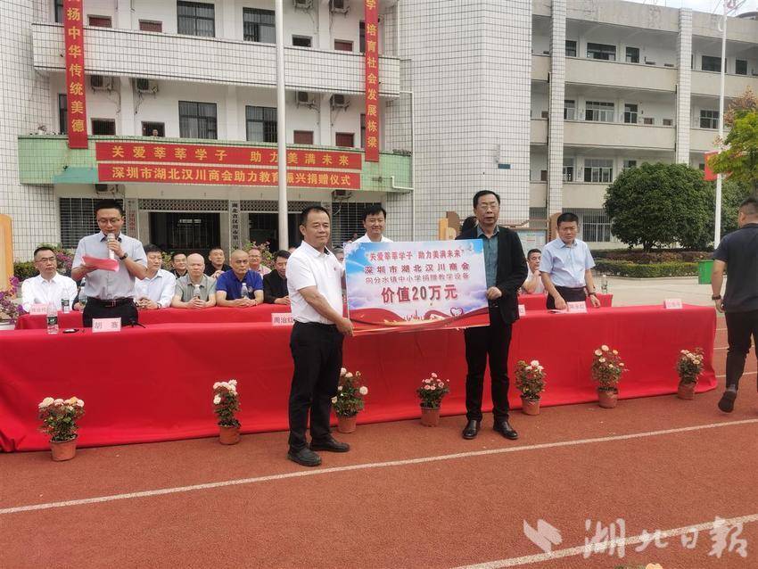 湖北日报讯(通讯员张水明、曾昌)“谢谢‘爱心商会’,谢谢叔叔阿姨们,我们一定发奋学习,自立自强,将来回报社会。”10月5日,深圳市湖北汉川商会带着对汉川教育事业的深厚关怀,为分水镇中小学送来了价值20余万元的教育教学设备。在现场的学生代表们脸上洋溢着笑容。