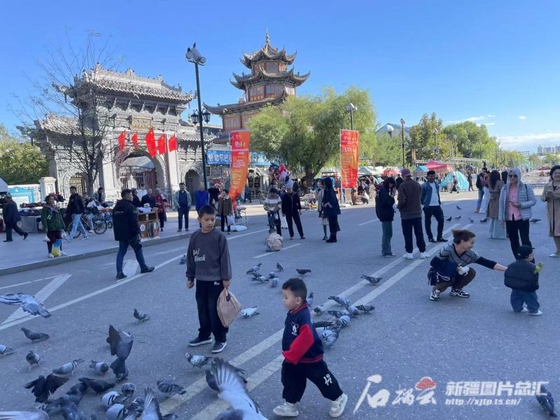 伊宁市喀赞其民俗旅游区游人与鸽子嬉戏。石榴云/新疆日报记者姚刚摄