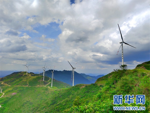 在铜仁市石阡县的大顶山风电场,24台挺拔的“大风车”迎风转动,源源不断输送绿色能源。新华网发(陈厦华 摄)