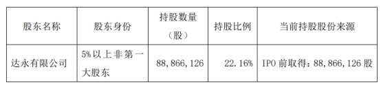 截至公告日,公司股东达永有限持有公司股份88,866,126股,占公司总股本的22.16%。该等股份均来源于公司首次公开发行股票上市前持有的股份。