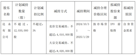 达永有限通过集中竞价交易减持期间为自公告披露之日起15个交易日后的3个月内;通过大宗交易方式减持期间为自公告披露之日起3个交易日之后的3个月内。在此期间如遇法律法规规定的窗口期,则达永有限不减持。若采取集中竞价交易方式减持,在任意连续九十个自然日内,减持股份的总数不超过公司股份总数的1%;采取大宗交易方式减持,在任意连续九十个自然日内,减持股份的总数不超过公司股份总数的2%。