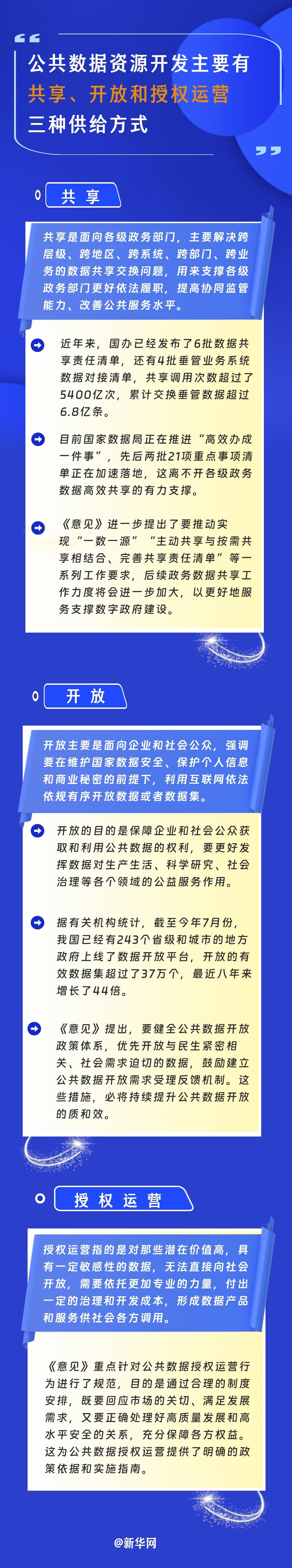 公共数据的特点就是体量大、质量好,而且价值潜能大,带动作用强。国家数据局副局长陈荣辉在发布会上介绍,《意见》明确了共享、开放和授权运营三种供给方式,主要是考虑到要按“需”施策、因“数”施策,既满足不同的开发利用需要,也提出针对性的管理要求,目的就是希望能够系统性地解决公共数据资源“供得出”的问题。