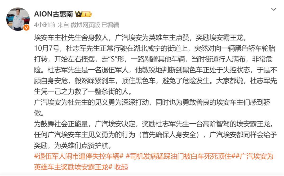 闹市中,一名男子突发疾病车辆失控,白色小车司机驾车死死顶着失控的车辆,阻止车辆撞向人群,湖北省通城县退役军人杜志军的勇敢行为受到社会各界的点赞(极目新闻报道《街头黑色轿车突然失控撞向人群,危急时刻一辆白车上前死死顶住》)。10月10日,广汽埃安公司决定,为鼓舞社会正能量,奖励杜志军一台埃安霸王龙汽车。极目新闻记者从通城县相关部门获悉,当地正在为杜志军申报见义勇为和“湖北好人”荣誉称号。