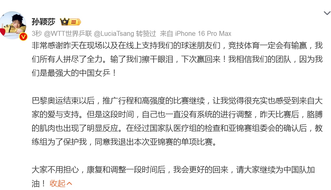 巴黎奥运结束以后,推广行程和高强度的比赛继续,让我觉得很充实也感受到来自大家的爱与支持。但是这段时间,自己也一直没有系统的进行调整,昨天比赛后,胳膊的肌肉也出现了明显反应。在经过国家队医疗组的检查和亚锦赛组委会的确认后,教练组为了保护我,同意我退出本次亚锦赛的单项比赛。