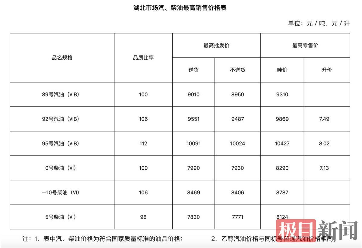 10月10日,湖北省发改委发布公告,湖北成品油价格按机制上调,92号汽油、95号汽油、0号柴油每升分别上涨0.11元、0.12元、0.12元。调价后,95号汽油价格重返8元区间。