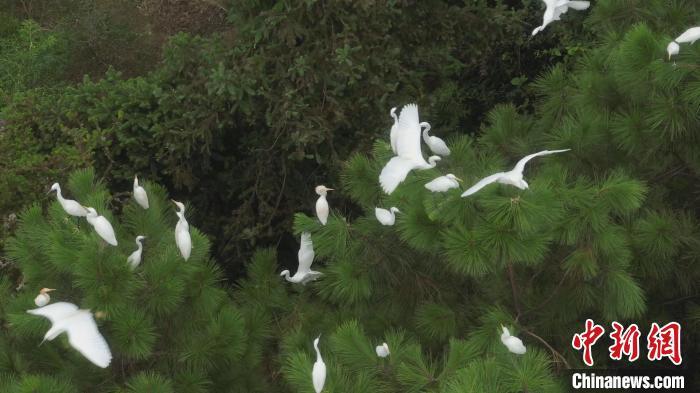 白鹭和牛背鹭停在树枝上歇息。盘俊杰 摄