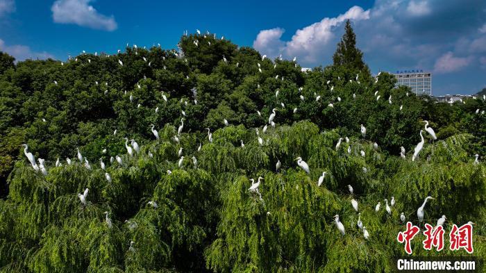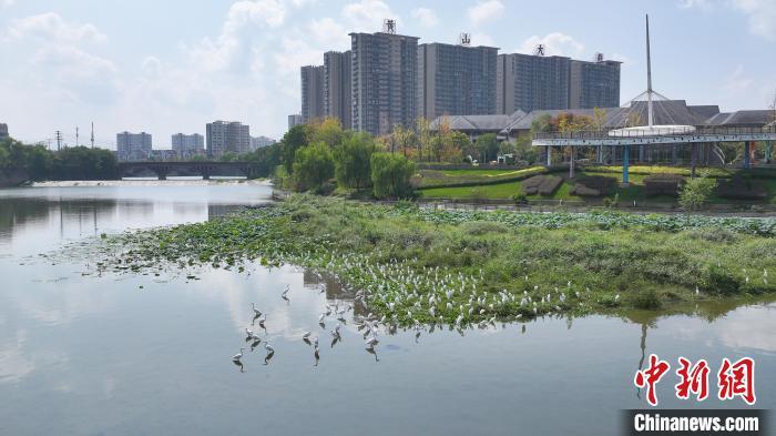 中新网黄山10月11日电(任俊翔)近日,在安徽省黄山市中心城区屯溪三江口省级湿地公园,迎来千只白鹭栖息的美景。新安江流域水草丰美,白鹭时而浅水区伫立,时而翱翔于蓝天,或静或动,构成一幅幅人与自然和谐共处的生态画卷。