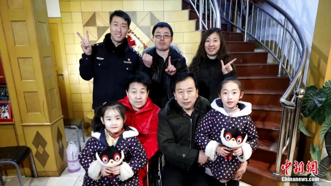 2018年1月底,姜经纬去山西“老家”陪二老提前过春节,留下了这张“全家福”。 姜经纬与夏占海夫妇(中排)、他们的小儿子夫妇(上排中和上排右)以及小儿子的两个女儿(前排)。上海市公安局浦东分局供图