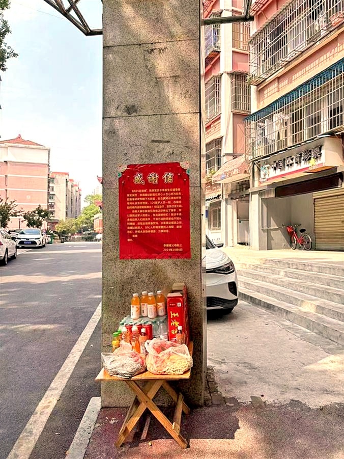 “感谢大家在我宝贝危难之际伸出援手,你们是我全家的恩人,我还不知道恩人们的名字。故在此地略备饮料、水果,表达感激之情,请路过的恩人、好心人自取。”待女儿病情稳定后,10月6日,李先生在事发路段张贴了一封红色的感谢信,并备上饮料和水果,感谢那些素不相识,但却在危难时刻出手相助的黄石好心人。