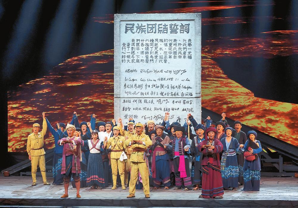 在全省深入学习贯彻习近平总书记给普洱民族团结誓词碑盟誓代表后代重要回信精神之际,10月10日晚,反映民族团结誓词碑光荣历史的民族史诗话剧、新时代优秀舞台艺术作品展演剧目《澜沧水长》在云南省大剧院演出。