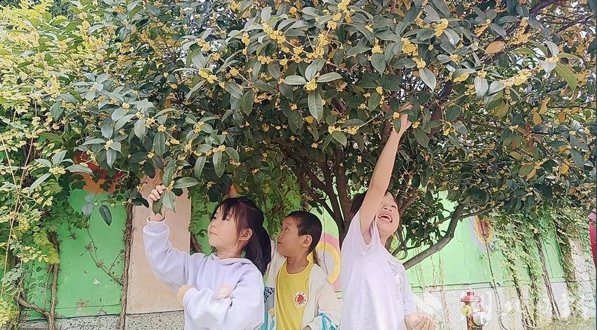 在活动中,教师们挖掘园所自然资源,通过提问的方式引导孩子们仔细观察桂花的特点,通过寻桂花树、品桂花香、解桂花秘、留桂花美、采桂花行等系列活动,引导幼儿从观察研究桂花,到用桂花制作香包、美食等,将桂花以另一种形式留存下来。