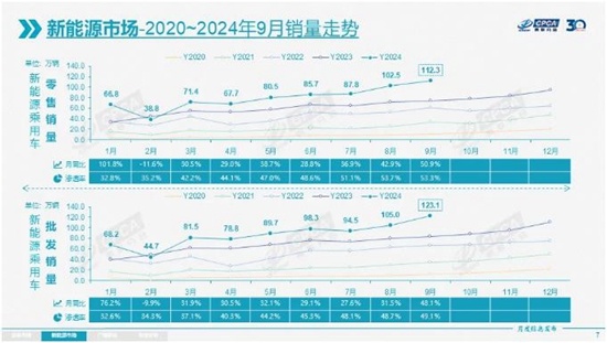 9月,国内新能源乘用车生产、批发、零售、出口上演“四重奏”,均创出历史月度新高。其中,零售连续第二个月突破百万辆大关,达112.3万辆,同比增长50.9%,环比增长9.6%;零售渗透率连续第三个月突破五成,9月达到53.3%,较去年同期提升16.4个百分点。