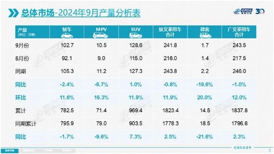 生产方面,9月,狭义乘用车生产241.8万辆,同比微降0.8%,环比增长11.9%。