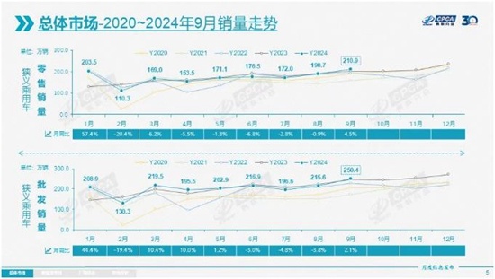 9月,国内狭义乘用车批发、零售销量皆实现同环比双增长。其中,批发250.4万辆,同比增长2.1%,环比大幅增长16.1%,创造历史同期新高。零售规模年内第二次摸高200万辆上方,并创造年内新高,共零售210.9万辆,同比增长4.5%,环比增长10.6%。