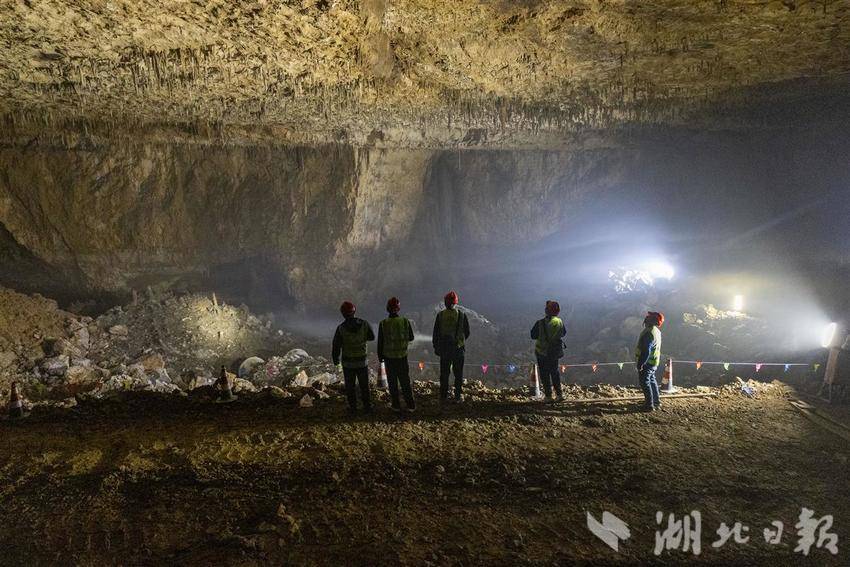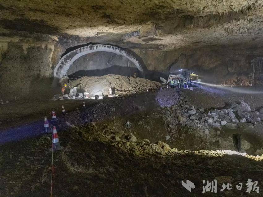 楼门隧道位于利川市沙溪乡大沙溪村,全长3387米,最大埋深约346米。这次挖出的大型溶洞,绵延300多米,类似一个标准足球场大小。据观察,溶洞呈蜂窝状,分上中下三层布局,利咸高速公路线位在溶洞中层穿行。目前,建设者们正开展攻坚施工。鄂西项目群地质结构极其复杂,被工程界称为“土木工程禁区”,一些复杂的隧道工程更被称作“世界级难题工程”,湖北交投集团修建的宜来高速鹤峰段今年已建成通车。