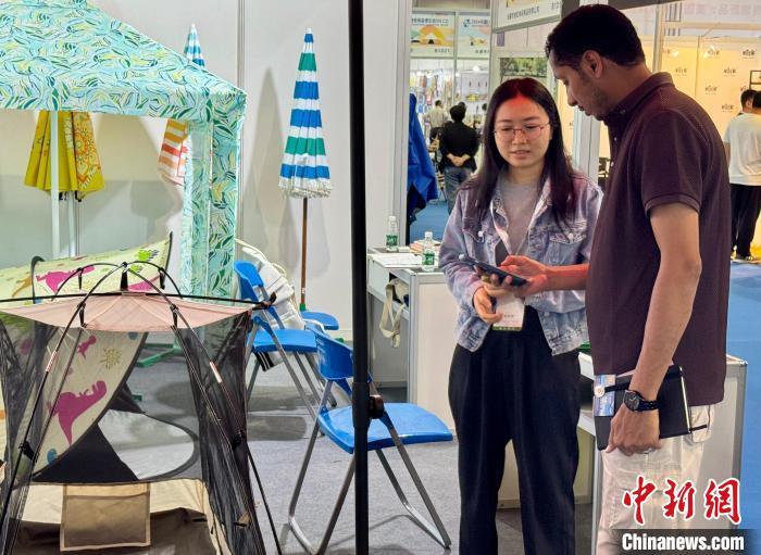 10月13日,一位外商(右一)在中国义乌文化和旅行产品交易博览会了解户外产品。董易鑫 摄