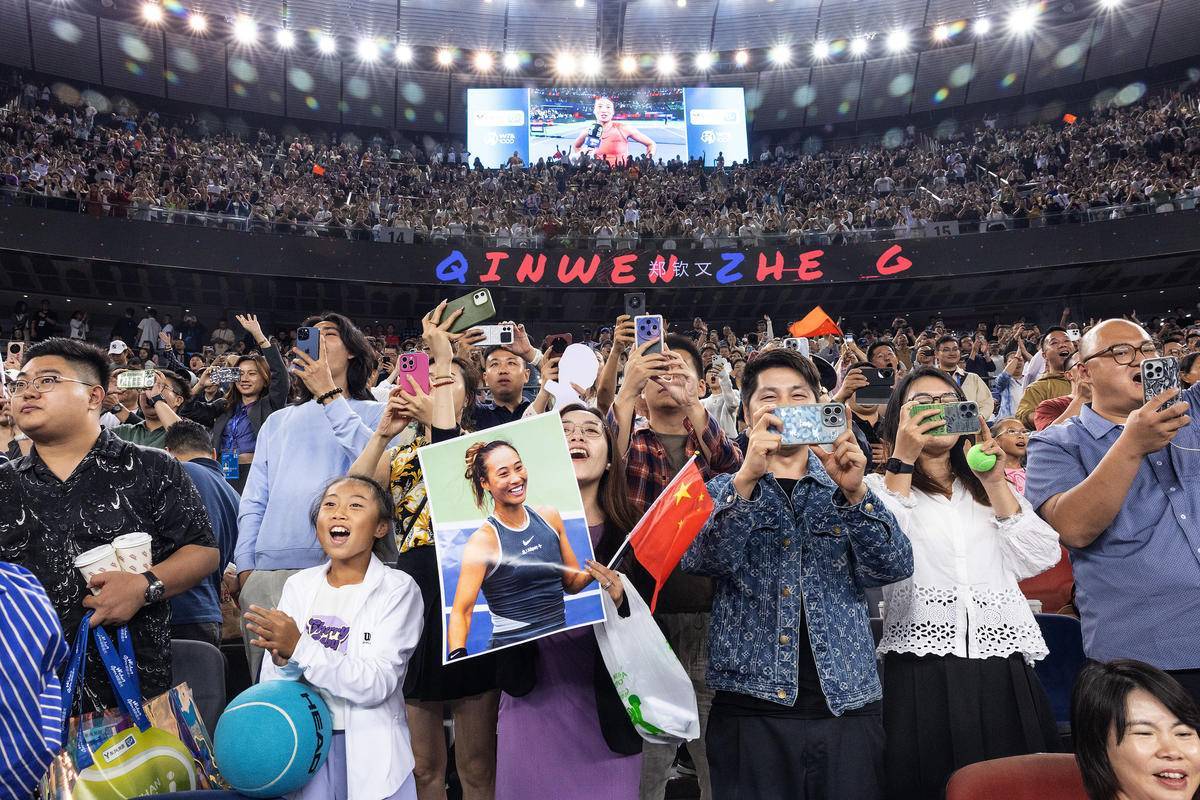 10月11日,2024WTA1000武汉网球公开赛女子单打1/4决赛,现场球迷用手机记录郑钦文的获胜现场。(湖北日报全媒记者 任勇 摄)