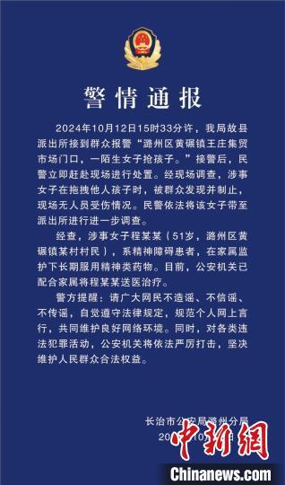 中新网长治10月13日电 (记者 李庭耀)山西省长治市公安局潞州分局13日发布警情通报称,10月12日15时33分许,该局故县派出所接到群众报警“潞州区黄碾镇王庄集贸市场门口,一陌生女子抢孩子。”