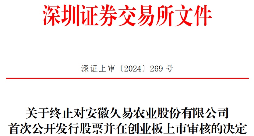 中国经济网北京10月14日讯 深交所网站10月12日披露关于终止对安徽久易农业股份有限公司(简称“久易股份”)首次公开发行股票并在创业板上市审核的决定。