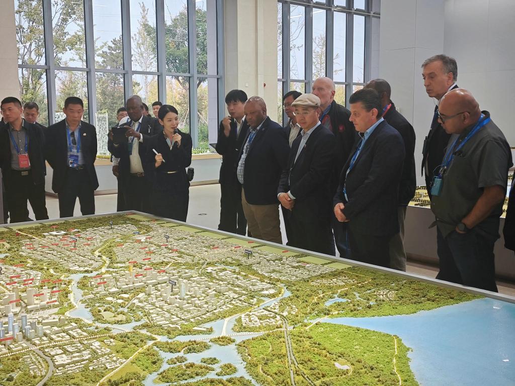 10月12日,国际友人在雄安新区启动区综合服务中心参观。新华社记者刘杨 摄