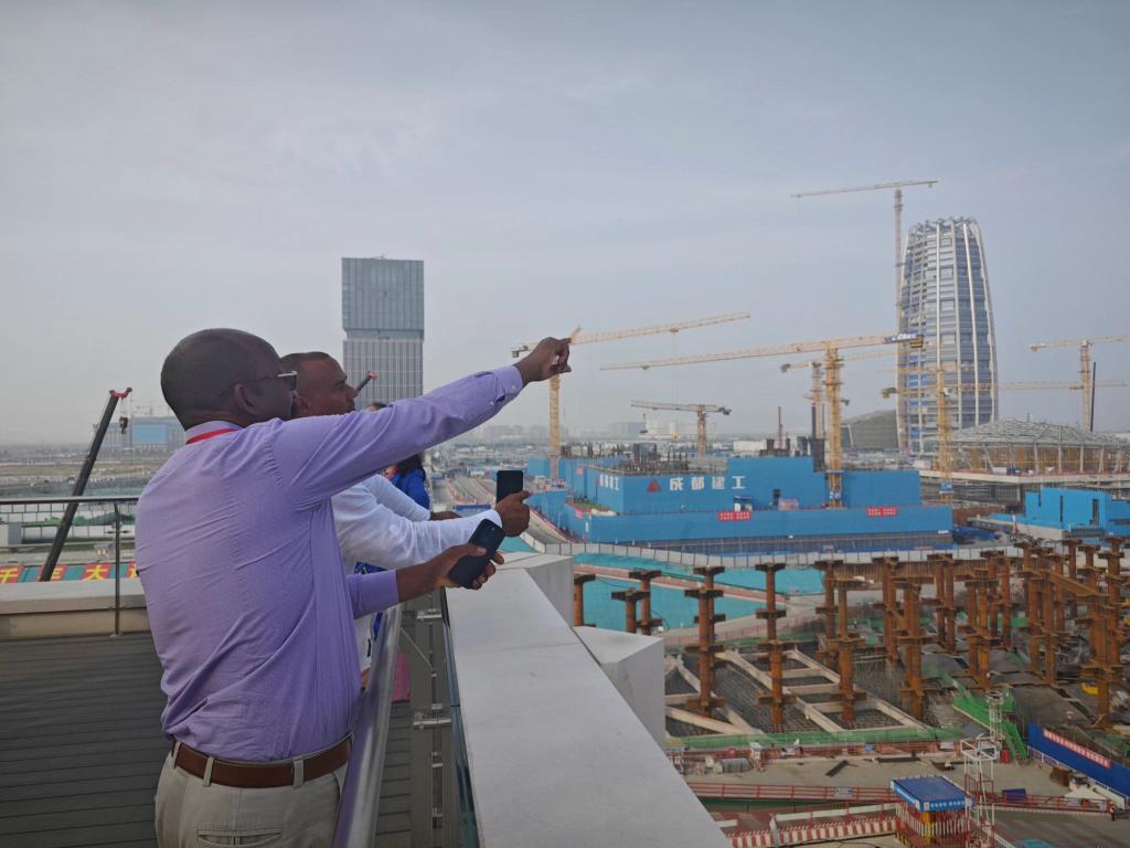 10月12日,国际友人在雄安新区东西轴线调度指挥中心观景台上考察建设现场。新华社记者刘杨 摄