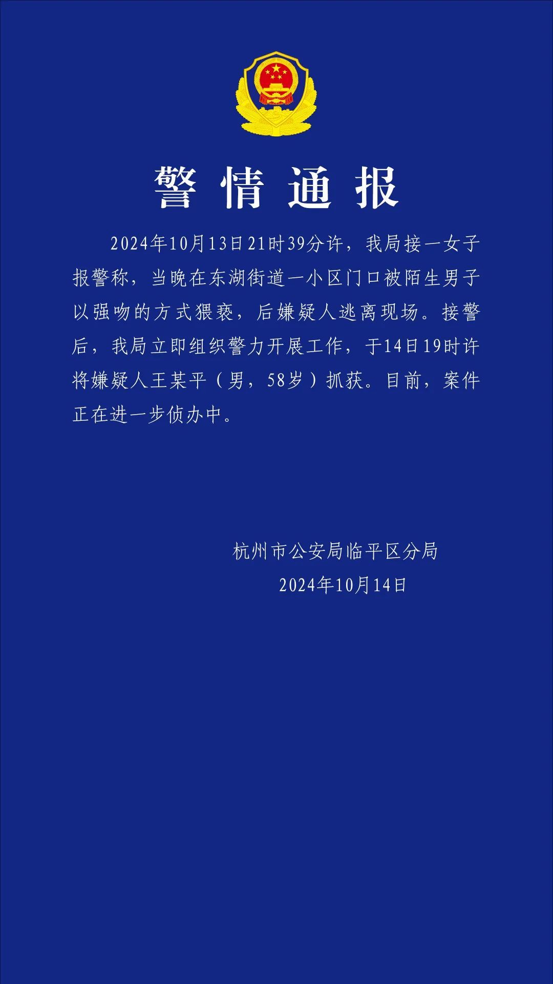 中新网10月15日电 据“临平公安”微信公众号消息,杭州市公安局临平区分局14日发布警情通报称,10月13日21时39分许,该局接一女子报警称,当晚在东湖街道一小区门口被陌生男子以强吻的方式猥亵,后嫌疑人逃离现场。接警后,该局立即组织警力开展工作,于14日19时许将嫌疑人王某平(男,58岁)抓获。目前,案件正在进一步侦办中。