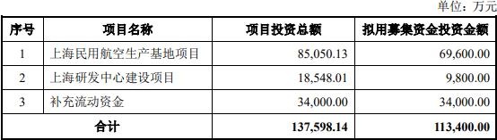 本次发行股票募集资金总额不超过人民币113,400.00万元(含本数),在扣除本次发行相关的发行费用后,公司拟将募集资金用于上海民用航空生产基地项目、上海研发中心建设项目、补充流动资金。