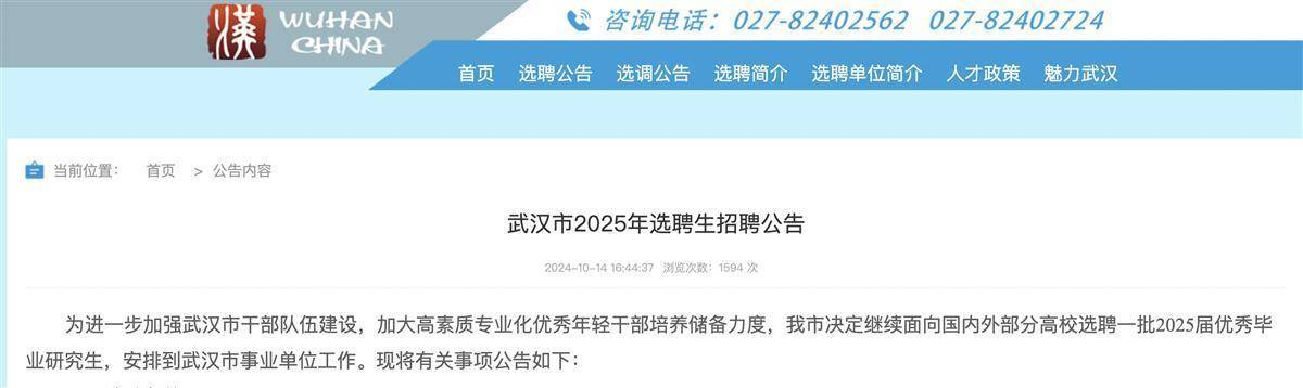 湖北日报讯(记者严芳婷)10月14日,中共武汉市委组织部武汉市人力资源和社会保障局发布《武汉市2025年选聘生招聘公告》,内容如下: