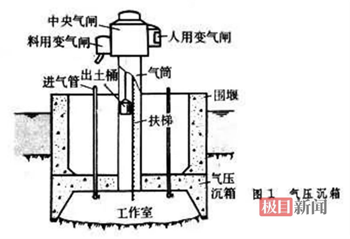近百年来,世界上桥梁深水基础唯一的施工方法就是气压沉箱法。气压沉箱犹如倒扣的一只饭碗沉入水底,“碗”内有压缩空气,水进不去,人在里面工作,要承受附加的大气压力。赵煜澄在文中写到,水深每增加10米就增加1个大气压力,水深40米时,人要承受4个大气压力,即每平方厘米有4公斤压力,这是气压沉箱法能承受水深的极限。