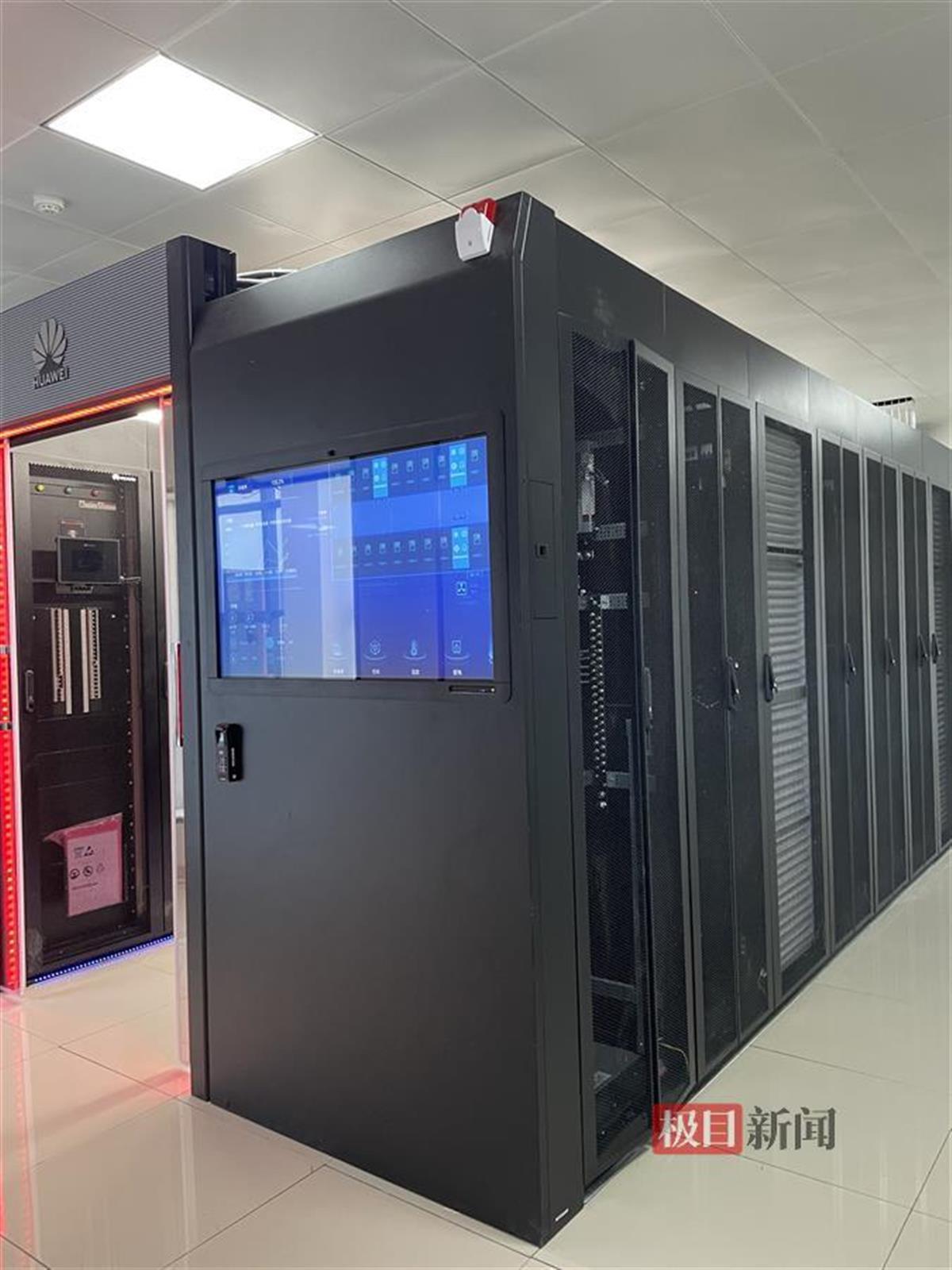 当天,极目新闻记者在竹溪“国芯一号”智算中心探访时看到,机房内的服务器为国产华为服务器,服务器机柜上显示当前负载率、温度、配电等信息。