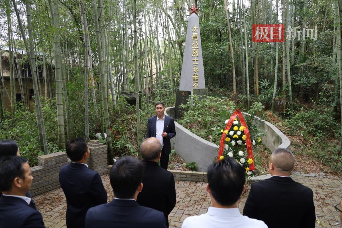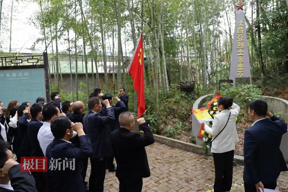 接着,党员们来到天城镇山下村,瞻仰沈昌亚革命烈士纪念碑,深切缅怀这位崇阳县第一名共产党员。缅怀活动开始,大家怀着沉重的心情徒步进入陵园,来到沈昌亚烈士墓前,全体肃立并低头默哀,然后敬献鲜花,寄托哀思,并举起右手重温入党誓词。铿锵的誓言,在竹林上空回荡。青年党员夏恒为在场党员讲微党课,他讲述了沈昌亚烈士的革命故事:沈昌亚(1907-1927),天城镇鹿门栎咀村(今山下村十二组)人,1923年入党,是崇阳县第一个共产党员,1926年任省农协崇阳、蒲圻、通山三县联络员,曾进入毛泽东同志主办的中央武昌农民运动讲习所学习,1927年6月返回崇阳开展农运工作,同年8月被地主反动派杀害。中华人民共和国成立后,沈昌亚写给省农协特委的《崇阳农运工作报告》和《农讲所学习笔记》手迹被收藏在中国革命历史博物馆。