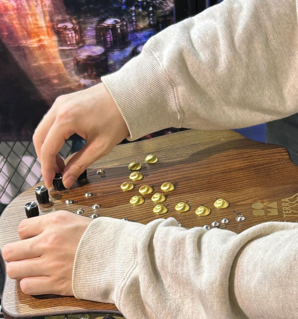 在欧洲一家创新型公司展位上,一款概念化合声器的演奏界面看似平淡无奇,但只需将手指放置在对应的金属凸起上,就能灵活控制各类音色,无需来回转动旋钮。另一款人声接触式麦克风能把演奏者声音转变成带特效的节拍、领唱,不但能作为音乐背景合声器,还能在音乐演出现场调节、处理人声,拓展传统歌唱的界限。