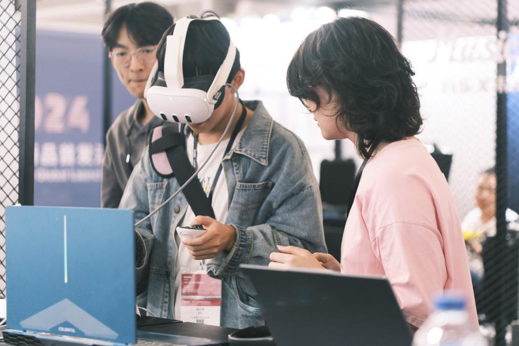 图为观众在工作人员的帮助下试玩音乐VR游戏。受访方供图