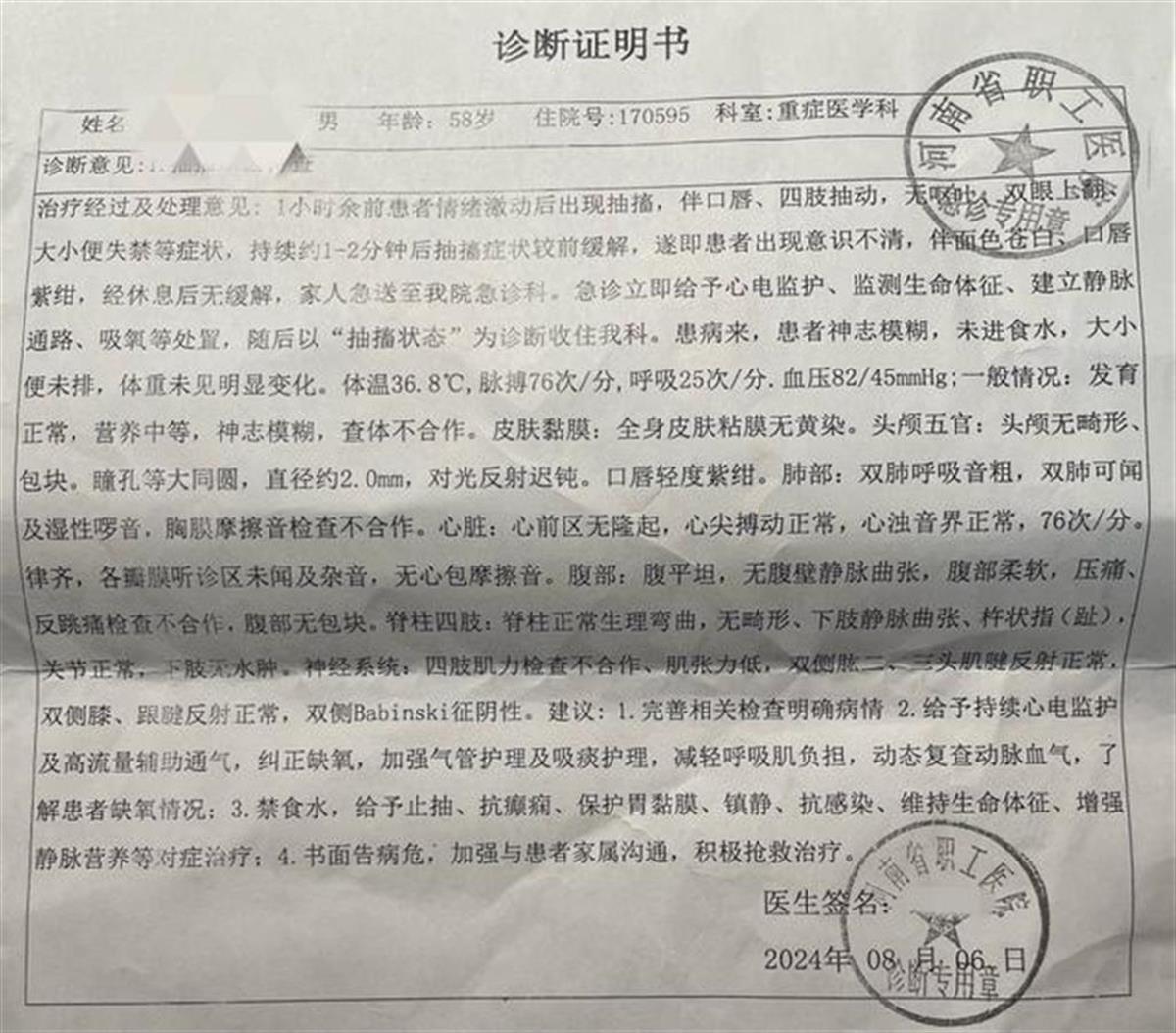 诊断证明书显示,武勇面色惨白,浑身抽搐,陷入昏迷,血压82/45mmhg,紧急抢救,书面告知病危。该事件发生后,武勇无法正常入睡,常常精神恍惚高喊救命,对黑暗幽闭的环境产生强烈的恐惧,8月9日被查出双下肢血栓,以及双肺感染,严重的话甚至危及生命。