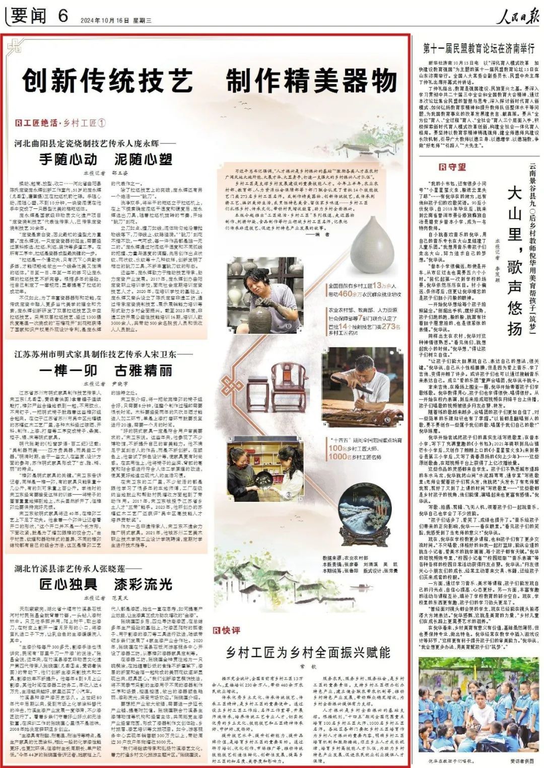 人民日报要闻版今起推出“工匠绝活·乡村工匠”系列报道,走近器物制作、刺绣印染、食品制作等行业领域乡村工匠名师,记录他们传承非遗技艺、促进乡村特色产业发展的故事。
