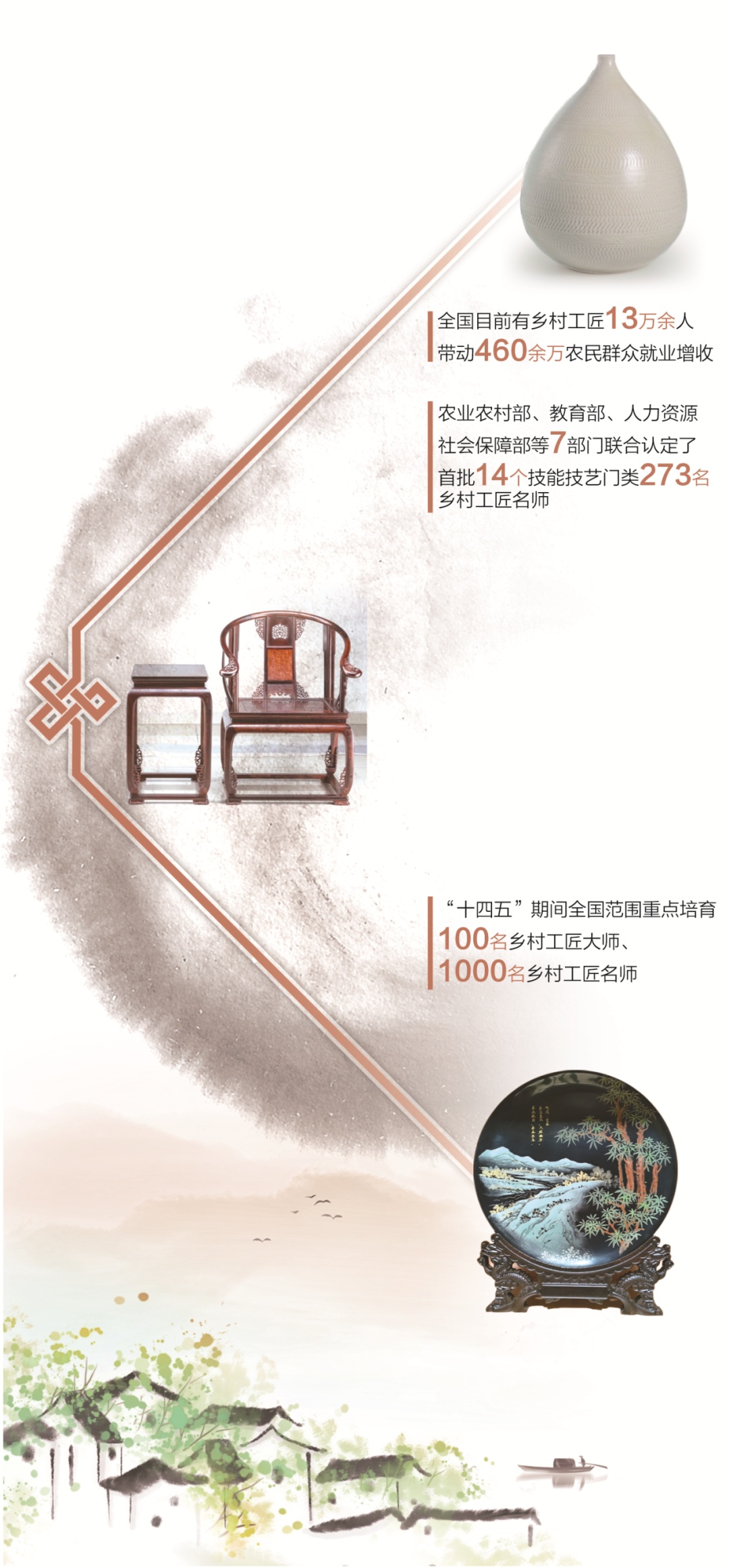 据不完全统计,全国目前有乡村工匠13万余人,直接培训230余万人,带动460余万农民就业增收。