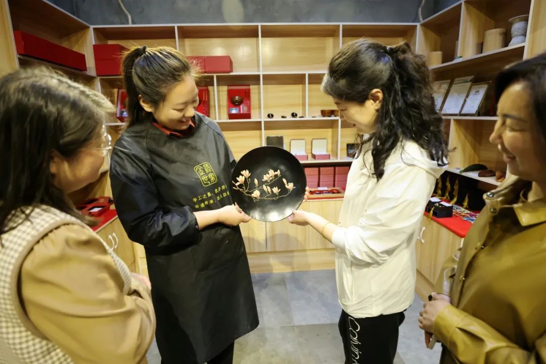 在漆器工坊,张晓莲全神贯注地为一只碗髹涂,在她缠着砂纸的食指不断摩挲下,漆层的断面和金箔一起构成的美丽花纹逐渐显现出来,颇具匠心。“我们创新漆艺髹饰技法,将不同季节采割的生漆用于不同的漆器制作工序和场景,控温控湿,做出的漆器颜色艳丽、漆彩流光,深受市场欢迎。”张晓莲介绍。