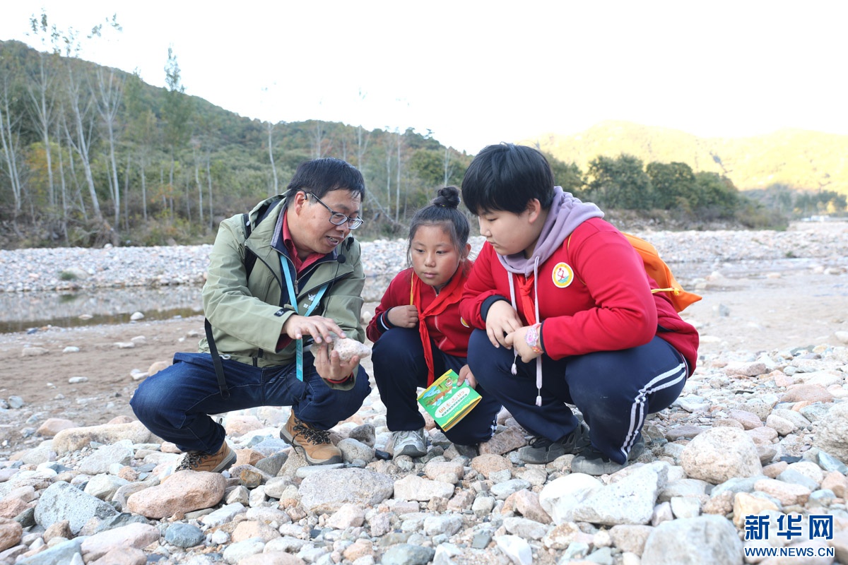 在活动的“河滩寻宝”环节,学生们到大石河的河滩搜寻不同类型的石头,并请专家进行讲解。新华网 魏会博 摄