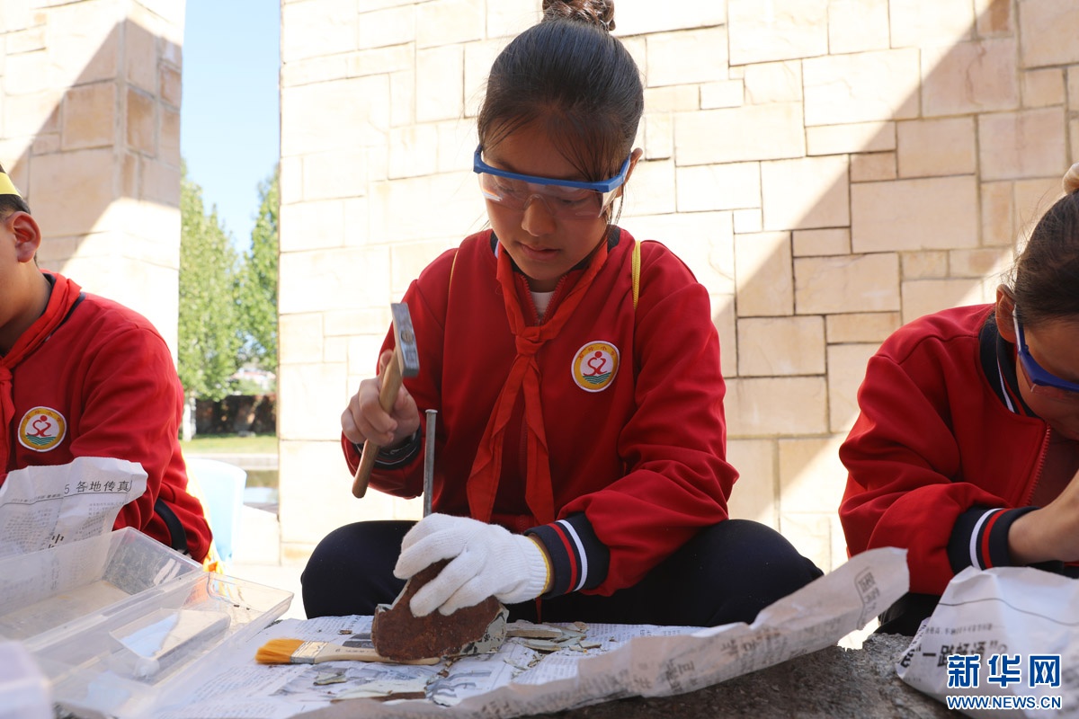 学生们在专家的指导下敲开石头寻找狼鳍鱼化石。新华网 魏会博 摄