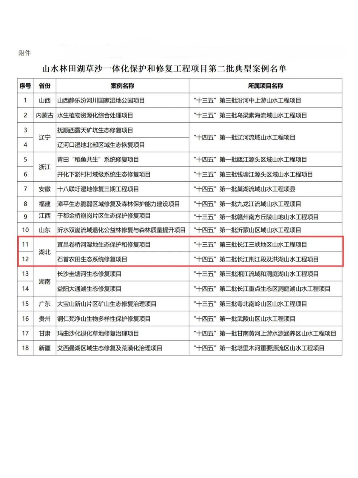 近日,财政部、自然资源部、生态环境部公布山水工程第二批18个典型案例,湖北省申报的“宜昌卷桥河湿地生态保护和修复项目”“石首农田生态系统修复项目”都成功入选。截至目前,包括第一批入选的“枝江金湖湿地生态修复项目”在内,湖北省已有三个项目入选全国山水工程典型案例。